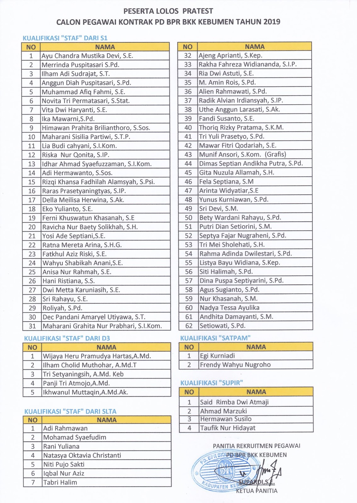 Pengumuman Peserta Lolos Pratest Calon Pegawai Pd Bpr Bkk Kebumen